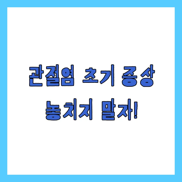 * 지속적인 통증: 특정 관절 부위에 계속해서 통증이 느껴져요. 이런 통증은 관절염 초기 증상일 수 있습니다. * 아침 강직: 아침에 일어났을 때 관절이 뻣뻣해서 움직이기 힘들어요. 아침 강직은 흔한 관절염 초기 증상입니다. * 붓기: 관절 주변이 붓고 열감이 느껴질 수 있어요. 붓기와 열감도 관절염 신호일 수 있습니다. * 관절 운동 범위 감소: 관절을 움직일 수 있는 범위가 줄어들어요. 움직임 제한은 관절 건강 이상 신호입니다. * 염발음: 관절을 움직일 때 소리가 나거나 삐걱거리는 느낌이 들어요. 관절에서 나는 소리도 주의 깊게 들어보세요. * 피로감: 특별한 이유 없이 피로를 느끼는 경우도 있어요. 이유 없는 피로도 관절염 초기 증상일 수 있습니다. * 체중 감소: 류마티스 관절염의 경우, 특별한 식단 조절 없이 체중이 줄기도 해요. 갑작스러운 체중 감소도 관찰해 보세요.